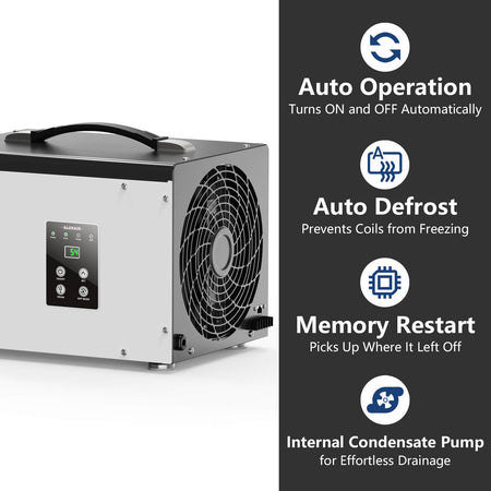 Dehumidifier For 1000 Sq Ft; offers an automatic pump drainage system, which can drain water up to 19.6 feet away, making it perfect for Crawl Space Dehumidification. It also features an auto-defrost mode, which prevents frost buildup, ensuring efficient operation in low-temperature environments.