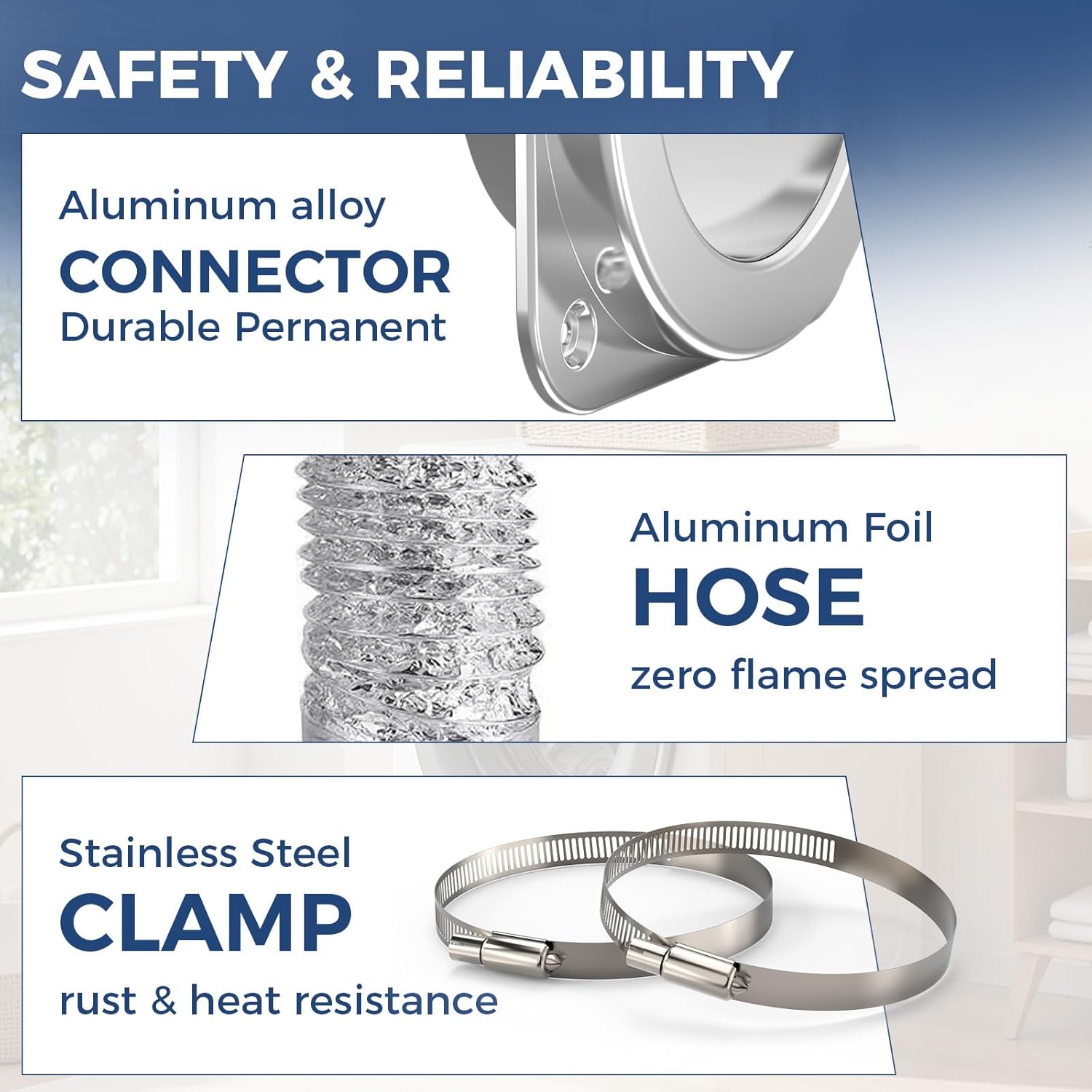 Heat-Resistant Materials for Safer Operation: Constructed with durable aluminum and heat-resistant foil ducting. The quick-release magnetic connection allows easy access for lint inspection and removal, helping reduce buildup.