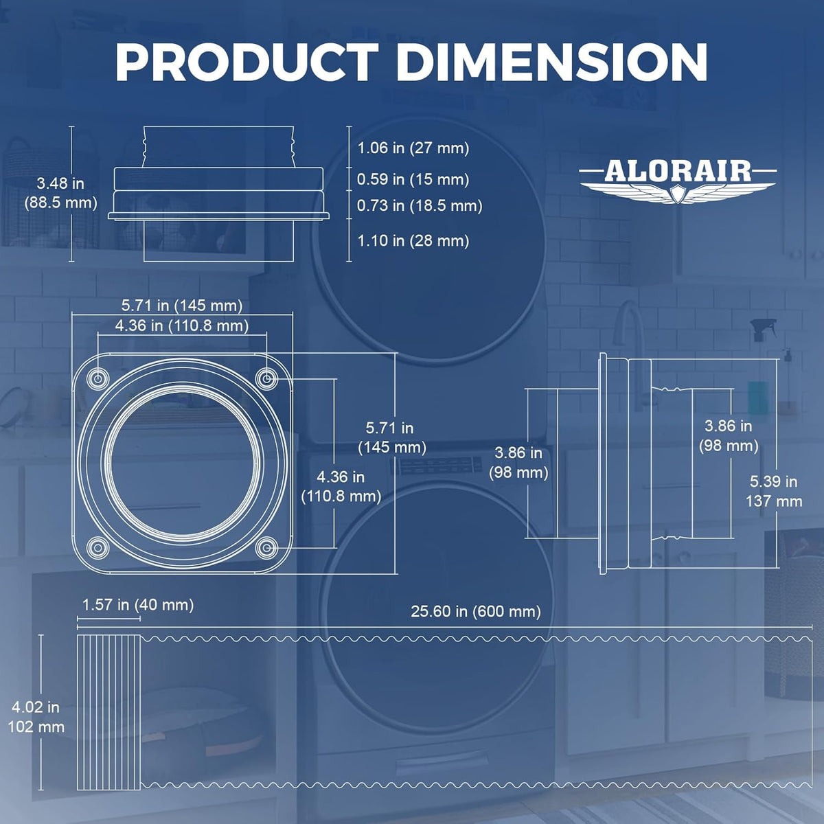 Space-Saving Design with Clean Look: Telescoping vent hose allows the dryer to sit closer to the wall than rigid ducts. Ideal for compact laundry spaces, with a clean, professional aluminum finish.